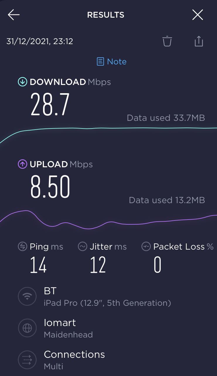 This is when you know BT is not quite being truthful about your max connection speed when in November it was consistently at 55 and now always under 30… engineer booked and will certainly be asking them to explain. Also if you live in house 8 on my road you get 900! Unbelievable