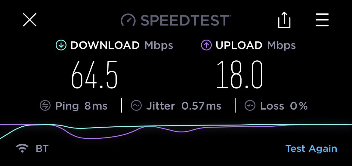 My o2 phone verses my current BT broadband π€¦π»ββοΈ BT just wins. Half the speed I had a month ago. Hope for good news to report next week.