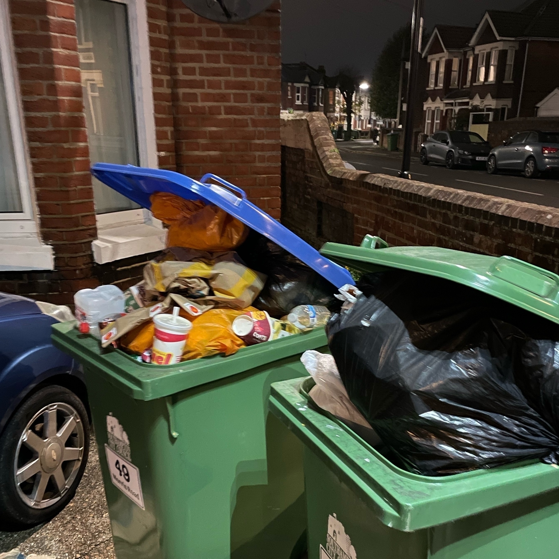 We moved from a village to the city. It’s an Excellent location we love it’s proximity to shops, train and vibrancy but most of our street is rented out to students as HMOs (houses of multiple occupancy) like ours was until we bought it, since moving in I have seen 2 grow additional bedrooms in the lofts and gardens and have opposed a whole “house” being built in a garden, the HMOs are packed in by greedy landlords and if they can’t get extra buildings build they just figure out how to gut the inside for more rooms. One of the many issues this causes is there is not enough bins and thus the collection of bins is not adequate. As bin day draws near or not (see photo) more and more items due to our proximity to the coast are blow down the road and no longer anyone’s issue, it seems that around 6 weeks ago my oldest cat who likes to wander, we suspect cut his tongue on a tin can and although he has 3 set of antibiotics and pain killers he has lost a sizeable chunk of his tongue and over the last few days he can’t eat and it seems after various vets trips and hundreds of pounds it’s likely he will die. I hate landlords so much. And if your a student or someone crammed into a property not only does it look untidy and trashes the local environment you may do more damage that you think so hey try and manage you bins so the lid closes, if it doesn’t ask the council for another bin or make a trip to the tip. Don’t make our street look like a tip and become dangerous for its occupants and their pets.