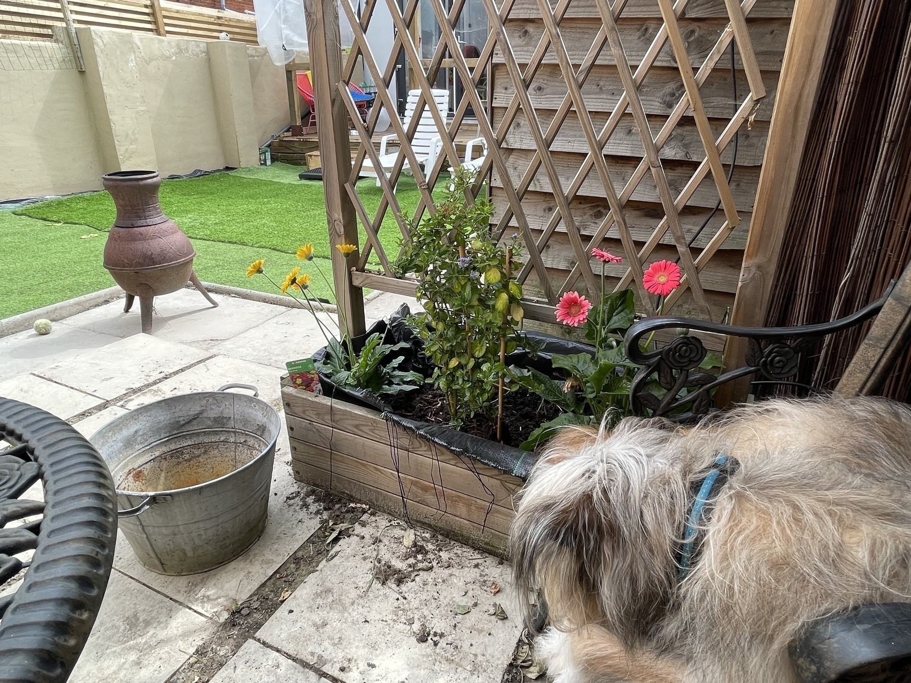 Monty is already liking my new corner of the garden which is now slowly being set up.
