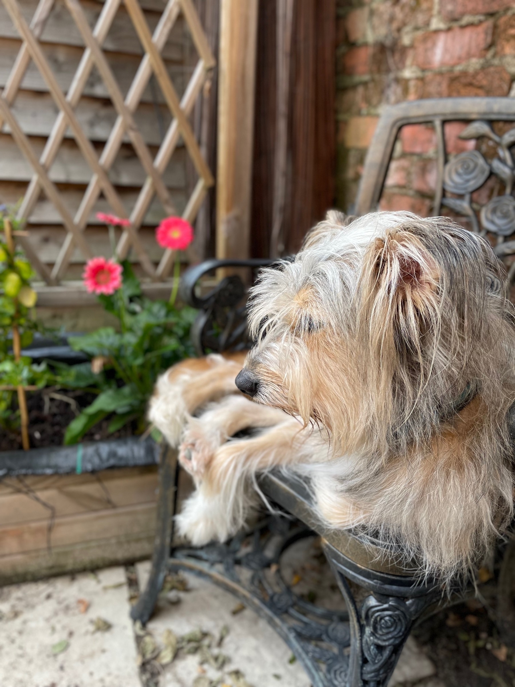 Monty and I are getting happy in our new slowly coming together new corner of the garden #lobstershack2 🐶 🪴 🕸️