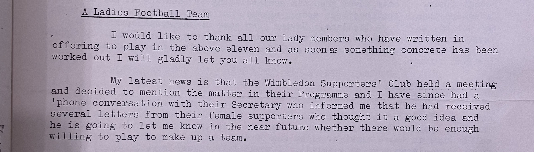 Before marrying my Dad my mum followed Chelsea. Becoming more of a Dons follower after but back in 1966/67 she received the supporters newsletter in which they were considering starting a ladies team as was Wimbledon Supporters’ club. In 2 days time the National team play in the World Cup final! ⚽️
