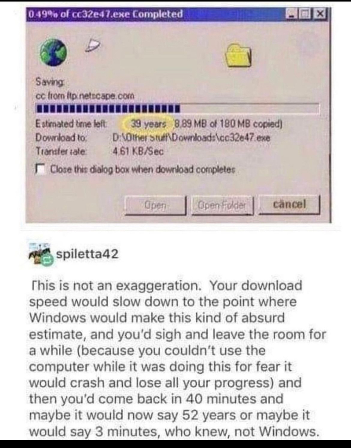 These progress bars etc and visuals and time estimates are difficult to do but I do love this 😂 imagine waiting 39 years for a download
