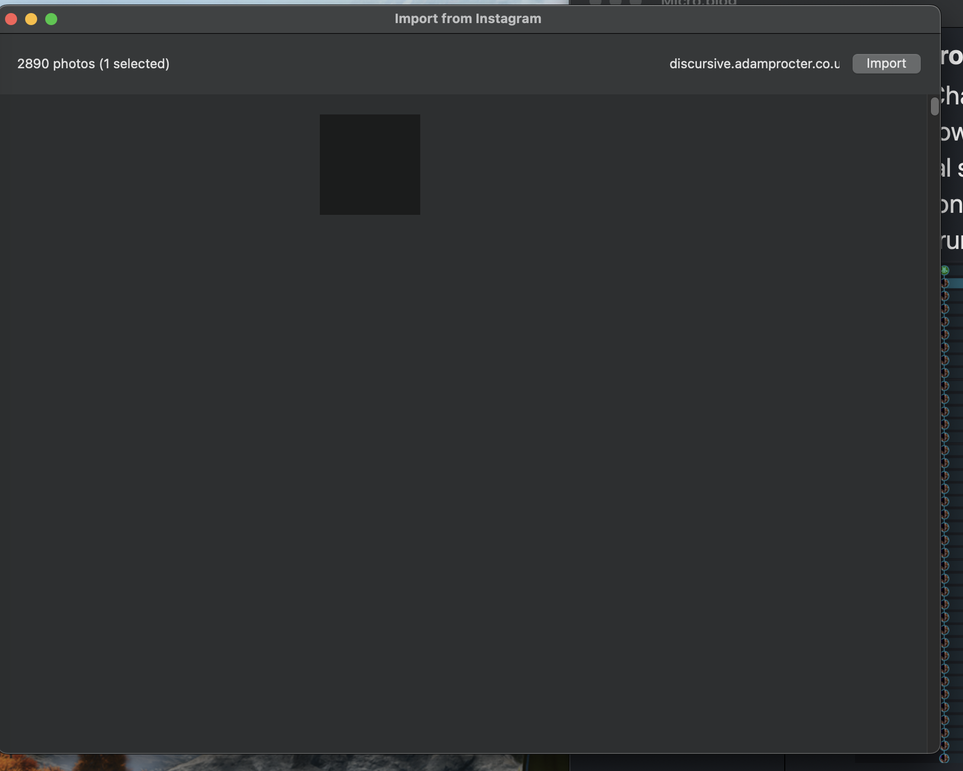 my images appear blank but I can select them see attached but I dont want to import them to discursive.adamprocter.co.uk I want to import them to my other micro.blog (in same account)