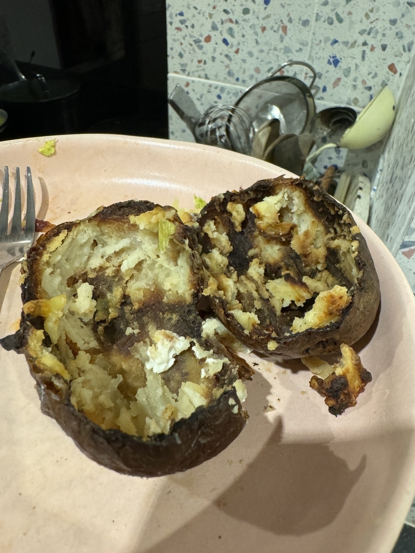 Day 9. Double baked crispy jacket potatoes + crispy bacon + crème fresh for the non vegans at home. (Mashed 🥔 filing was oat milk, vegan cheese, vegan Philadelphia + spring onions) mine topped with vegan cathedral city cheese served with simple salad - I ate my skins too mind. Crispy, creamy, nice!