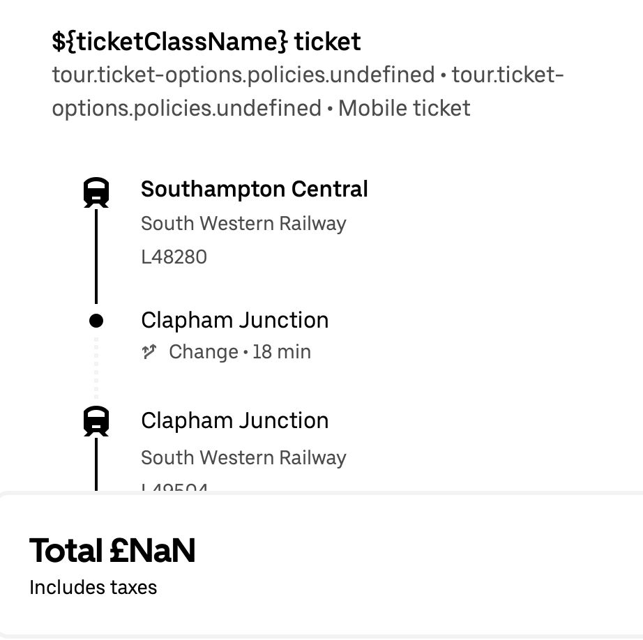 The Uber app refuses to book my trains (yes I phoned tech support and deleted app and restarted ohone, the website was even worse. See screenshot NaN and also price was higher !.. all I want is my 10% back and to use my uber cash! trying to book trains for football on Saturday since Tuesday…